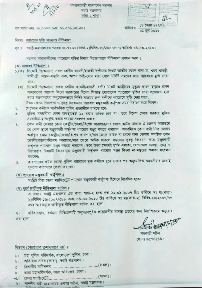 সরকার কারাবন্দিদের প্যারোলে মুক্তির বিষয়ে নিম্নরূপভাবে নীতিমালা প্রণয়ন করল উল্লেখ করা হয়।