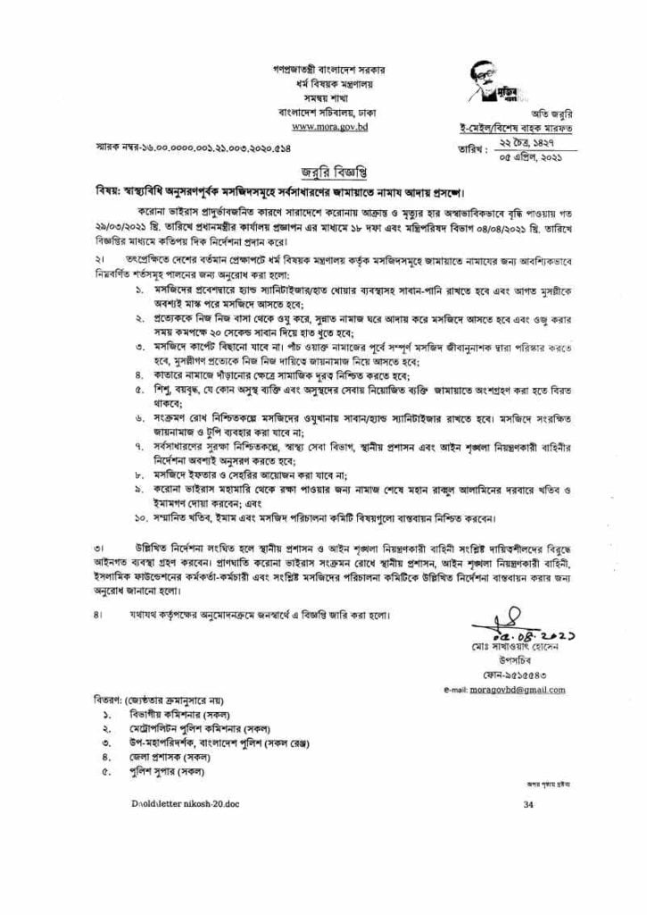 সর্বসাধারণের সুরক্ষা নিশ্চিত কল্পে, স্বাস্থ্য সেবা বিভাগ, স্থানীয় প্রশাসন এবং আইন শৃঙ্খলা নিয়ন্ত্রণকারী বাহিনীর নির্দেশনা অবশ্যই অনুসরণ করতে হবে। উল্লিখিত নির্দেশনা লঙ্ঘিত হলে স্থানীয় প্রশাসন ও আইন শৃঙ্খলা নিয়ন্ত্রণকারী বাহিনী সংশ্লিষ্ট দায়িত্বশীলদের বিরুদ্ধে আইনগত ব্যবস্থা গ্রহণ করবেন। প্রাণঘাতী করোনা ভাইরাস সংক্রমণ রোধে স্থানীয় প্রশাসন, আইন শৃঙ্খলা নিয়ন্ত্রণকারী বাহিনী, ইসলামিক ফাউন্ডেশনের কর্মকর্তা-কর্মচারী এবং সংশ্লিষ্ট মসজিদের পরিচালনা কমিটিকে উল্লিখিত নির্দেশনা বাস্তবায়ন করার জন্য অনুরোধ জানানো হয়েছে।