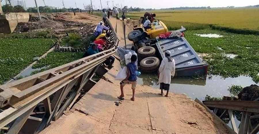 নেত্রকোনার ঠাকুরাকোনা-কলমাকান্দা সড়কের আশারানী খালের ওপর বিকল্প বেইলি সেতুটি ভেঙে গেছে। শনিবার (১৭ এপ্রিল) দুপুরে পাথরবোঝাই একটি ট্রাক নিয়ে সেতুটি ভেঙে খালে পড়ে যায়। এতে করে সেতুর দুপাশে সব ধরনের যানবাহন চলাচল বন্ধ রয়েছে।