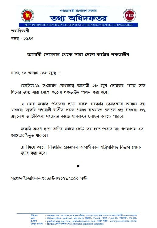 এতে বলা হয়েছে, ২৮ জুন সোমবার থেকে পরবর্তী নির্দেশ না দেওয়া পর্যন্ত সারা দেশে কঠোর লকডাউন পালন করা হবে। এ সময় জরুরি কারণ ছাড়া বাড়ির বাইরে কেউ বের হতে পারবেন না।