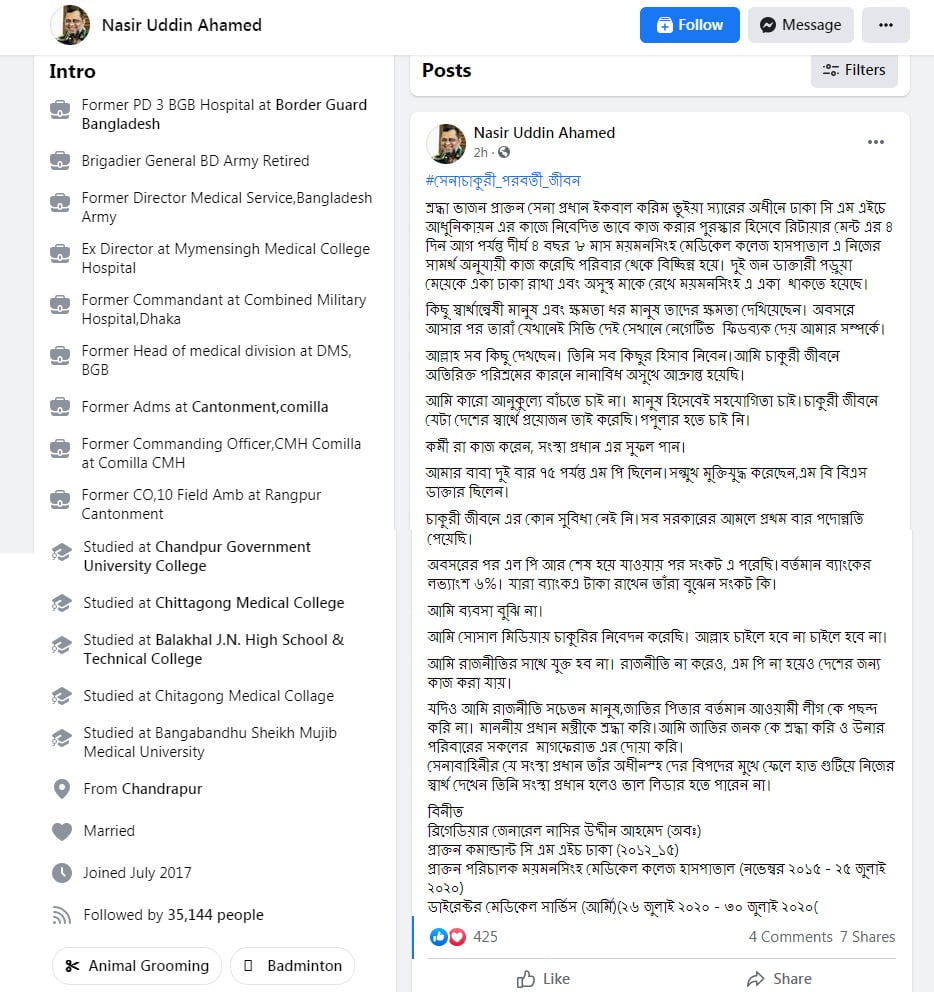 এদিকে সোমবার (১৩ সেপ্টেম্বর) তিনি আরও একটি স্ট্যাটাস দিয়েছেন। যেখানে তার সেনাবাহিনীতে চাকরির পরবর্তী জীবনের কথা উল্লেখ করেছেন। পাঠকদের জন্য তার সেই স্ট্যাটাসটি হুবহু তুলে ধরা হল-