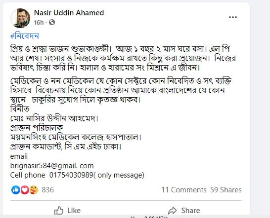 প্রিয় ও শ্রদ্ধা ভাজন শুভাকাঙ্ক্ষী। আজ ১ বছর ২ মাস ঘরে বসা। এল পি আর শেষ। সংসার ও নিজকে কর্মক্ষম রাখতে কিছু করা প্রয়োজন। নিজের ভবিষ্যৎ চিন্তা করিনি। হালাল ও হারামের সং মিশ্রনে এ জীবন। মেডিকেল ও নন মেডিকেল যে কোনো সেক্টরে কোনো নিবেদিত ও সৎ ব্যক্তি হিসাবে বিবেচনায় নিয়ে কোনো প্রতিষ্ঠান আমাকে বাংলাদেশের যে কোনো স্থানে চাকুরির সুযোগ দিলে কৃতজ্ঞ থাকব। এ বিষয়ে ফোনে তার সঙ্গে যোগাযোগ করা হলে ফোনটি ব্যস্ত পাওয়া যায়। তবে এসএমএস করলে তার রিপ্লেতে তিনি জানান, তার চাকরি প্রয়োজন।