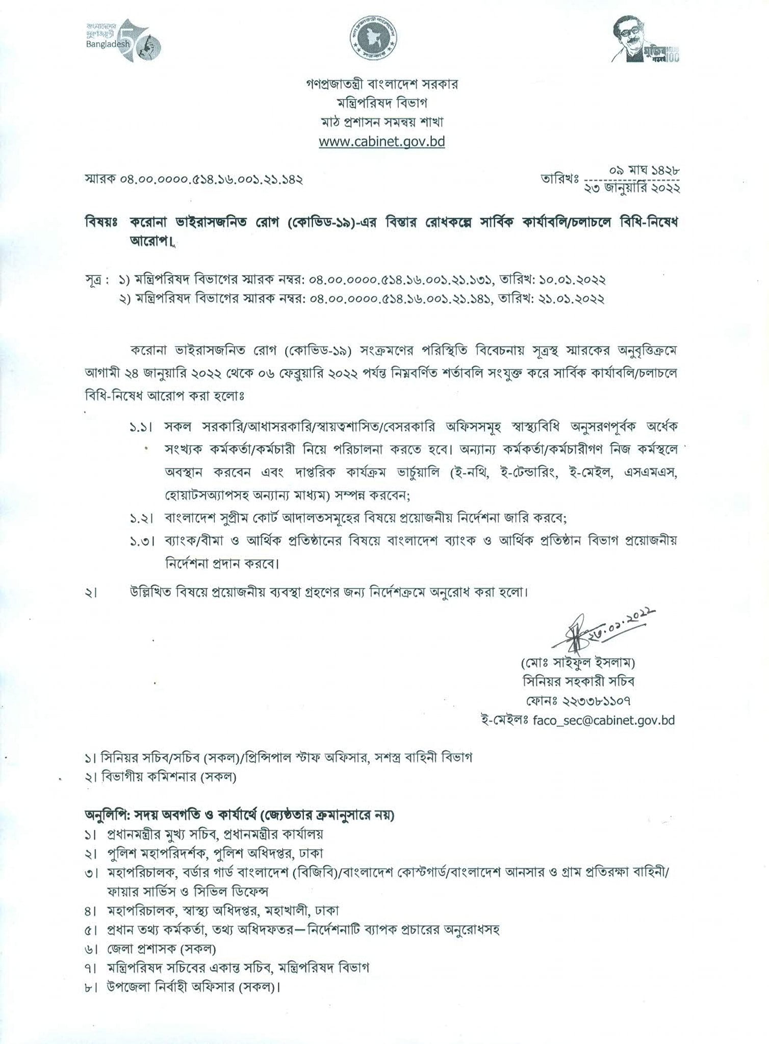প্রজ্ঞাপনে বলা হয়, কোভিড-১৯ সংক্রমণের পরিস্থিতি বিবেচনায় আগামী ২৪ জানুয়ারি থেকে ৬ ফেব্রুয়ারি পর্যন্ত সকল সরকারি, আধা সরকারি, স্বায়ত্তশাসিত ও বেসরকারি অফিসে স্বাস্থ্যবিধি অনুসরণ করে অর্ধেক সংখ্যক কর্মকর্তা-কর্মচারী নিয়ে পরিচালনা করতে হবে। অন্যান্য কর্মকর্তা-কর্মচারীরা নিজ কর্মস্থলে অবস্থান করবেন ও দাপ্তরিক কার্যক্রম ভার্চুয়ালি (ই-নথি, ই-টেন্ডারিং, ই-মেইল, এসএমএস, হোয়াটসঅ্যাপসহ অন্যান্য মাধ্যম) সম্পন্ন করবেন।