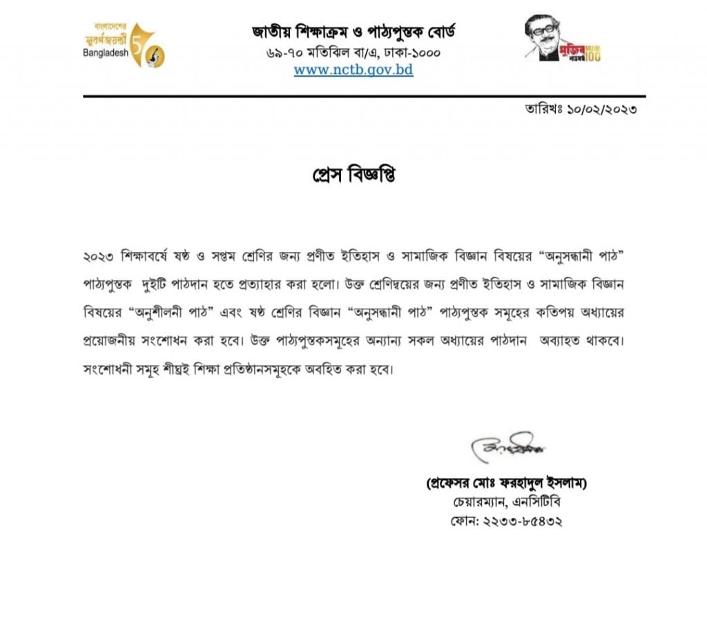 বিতর্কের মুখে ২০২৩ শিক্ষাবর্ষের ষষ্ঠ ও সপ্তম শ্রেণির ইতিহাস ও সামাজিক বিজ্ঞান বিষয় ‘অনুসন্ধানী পাঠ’ বই দুটির পাঠদান প্রত্যাহার করেছে জাতীয় শিক্ষাক্রম ও পাঠ্যপুস্তক বোর্ড (এনসিটিবি)। আজ শুক্রবার এক বিজ্ঞপ্তিতে এ তথ্য জানায় সংস্থাটি।