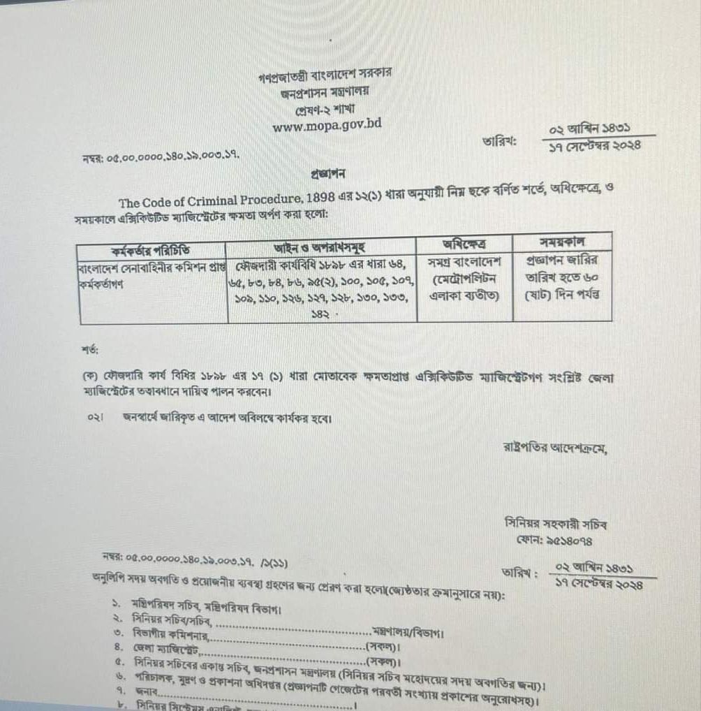 রাজধানীসহ সারা দেশে বাংলাদেশ সেনাবাহিনীকে নির্বাহী ম্যাজিস্ট্রেটের ক্ষমতা দিয়েছে সরকার। সেনাবাহিনীর কমিশনপ্রাপ্ত কর্মকর্তাদের এই ক্ষমতা দেওয়া হয়েছে।