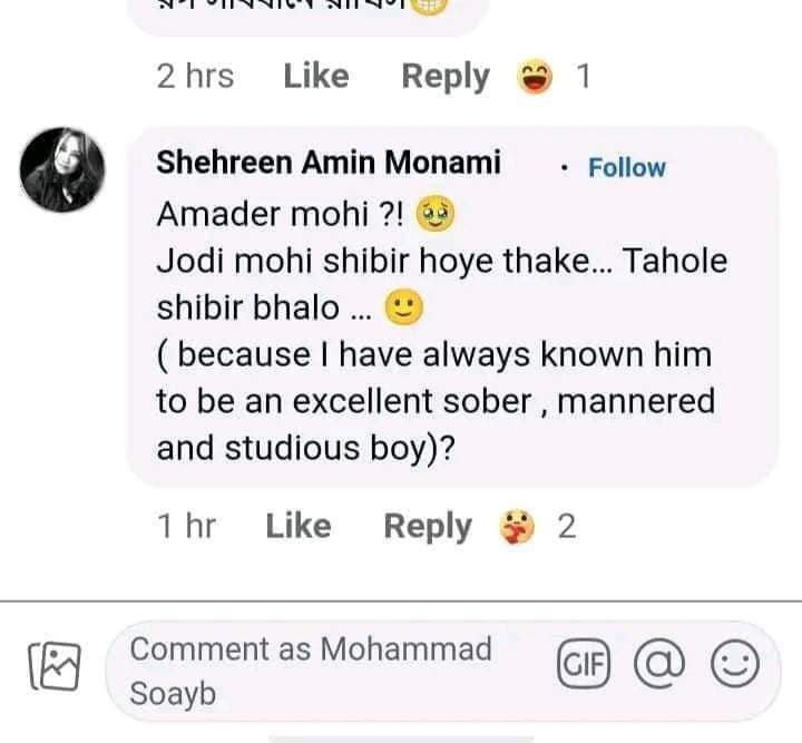 তার এই কমেন্টের পর থেকেই নতুন করে আলোচনা শুরু হয়। অনেকেই পোস্ট দিতে থাকেন। যদিও বিষয়টি ব্যাখ্যা করে একটি পোস্ট দিয়েছেন ঢাবি প্রভাষক শেহরীন আমিন মোনামি।