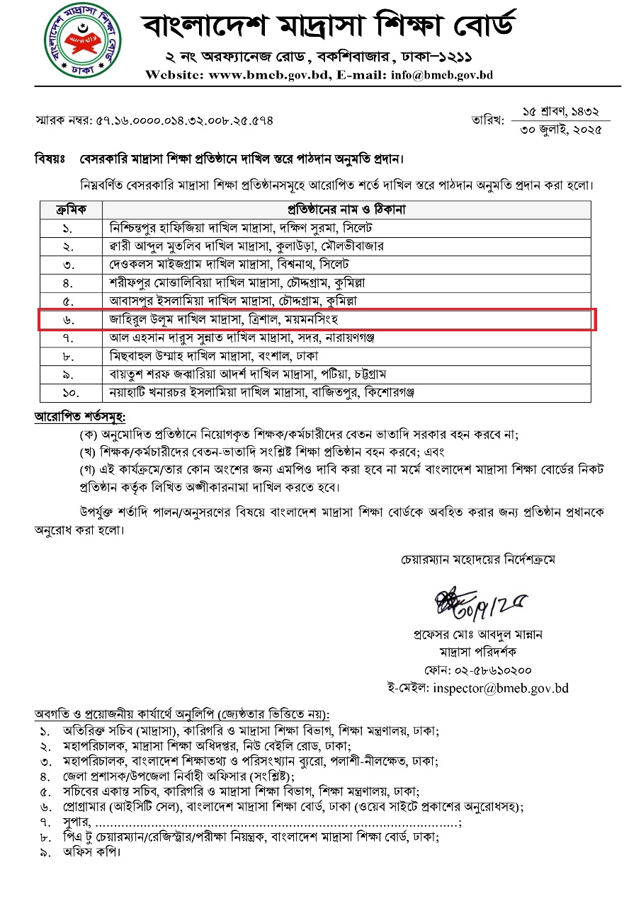 অনুমোদন পাওয়া মাদ্রাসাগুলো হল— সিলেটের দক্ষিণ সুরমায় অবস্থিত নিশ্চিন্তপুর হাফিজিয়া দাখিল মাদ্রাসা এবং মৌলভীবাজারের কুলাউড়ার ক্বারী আব্দুল মুতলিব দাখিল মাদ্রাসা। সিলেট জেলার বিশ্বনাথ উপজেলার দেওকলস মাইজগ্রাম দাখিল মাদ্রাসা। কুমিল্লার চৌদ্দগ্রাম উপজেলার দুটি প্রতিষ্ঠান—শরীফপুর মোত্তালিবিয়া দাখিল মাদ্রাসা ও আবাসপুর ইসলামিয়া দাখিল মাদ্রাসা—এবার দাখিল স্তরের পাঠদানের অনুমতি পেয়েছে।এ ছাড়া ময়মনসিংহের ত্রিশালের জাহিরুল উলুম দাখিল মাদ্রাসা, নারায়ণগঞ্জ সদরের আল এহসান দারুস সুন্নাত দাখিল মাদ্রাসা, ও ঢাকার বংশালের মিছবাহুল উম্মাহ দাখিল মাদ্রাসা রয়েছে এই তালিকায়। চট্টগ্রামের পটিয়া উপজেলার বায়তুশ শরফ জব্বারিয়া আদর্শ দাখিল মাদ্রাসা এবং কিশোরগঞ্জের বাজিতপুর উপজেলার নয়াহাটি খনারচর ইসলামিয়া দাখিল মাদ্রাসাও অনুমোদিত হয়েছে।