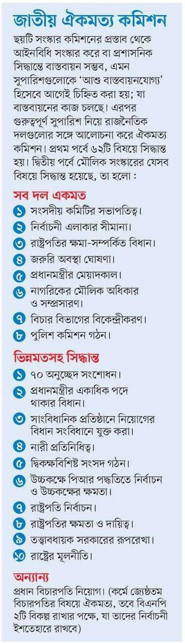 বিভিন্ন ক্ষেত্রে সংস্কারের লক্ষ্যে অন্তর্বর্তী সরকার গঠিত কমিশনগুলোর মধ্যে ছয়টি কমিশনের ১৬৬টি গুরুত্বপূর্ণ সুপারিশ নিয়ে রাজনৈতিক দলগুলোর সঙ্গে আলোচনা করে ঐকমত্য কমিশন। প্রথম পর্বে (২০ মার্চ-১৯ মে) দলগুলোর সঙ্গে পৃথকভাবে আলোচনা করে কমিশন। প্রথম পর্বে ঐকমত্য হয়নি, এমন ২০টির মতো মৌলিক সংস্কার প্রস্তাব নিয়ে গত ৩ জুন থেকে সব দলকে একসঙ্গে নিয়ে বিষয়ভিত্তিক আলোচনা শুরু করে ঐকমত্য কমিশন, যা গত বৃহস্পতিবার শেষ হয়। ২৩ দিনের বিষয়ভিত্তিক আলোচনায় মৌলিক সংস্কারের ১৯টি প্রস্তাবে ঐকমত্য ও সিদ্ধান্ত হয়। এর মধ্যে ৮টি বিষয়ে সব দল একমত হয়েছে। বাকি ১২টিতে বিভিন্ন দলের ভিন্নমত বা মন্তব্যসহ সিদ্ধান্ত হয়েছে।
