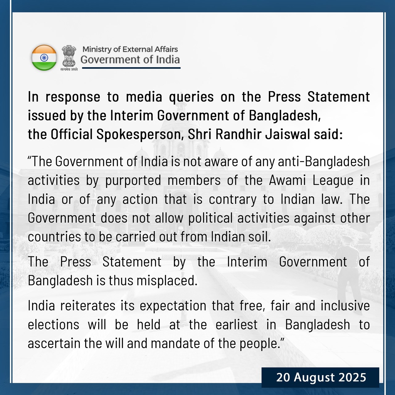 এর আগে বিকেলে ভারতে আওয়ামী লীগের রাজনৈতিক কর্মকাণ্ড নিয়ে একটি বিবৃতি দেয় ঢাকা। বিবৃতিটি পররাষ্ট্র মন্ত্রণালয়ের এক্স হ্যান্ডেলে প্রথমে প্রকাশ করা হয়। ঢাকার বিবৃতির কয়েক ঘণ্টার ব্যবধানে ভারতীয় গণমাধ্যমকর্মীরা এ বিষয়ে মুখপাত্র রণধীর জয়সওয়ালের দৃষ্টি আকর্ষণ করেন।