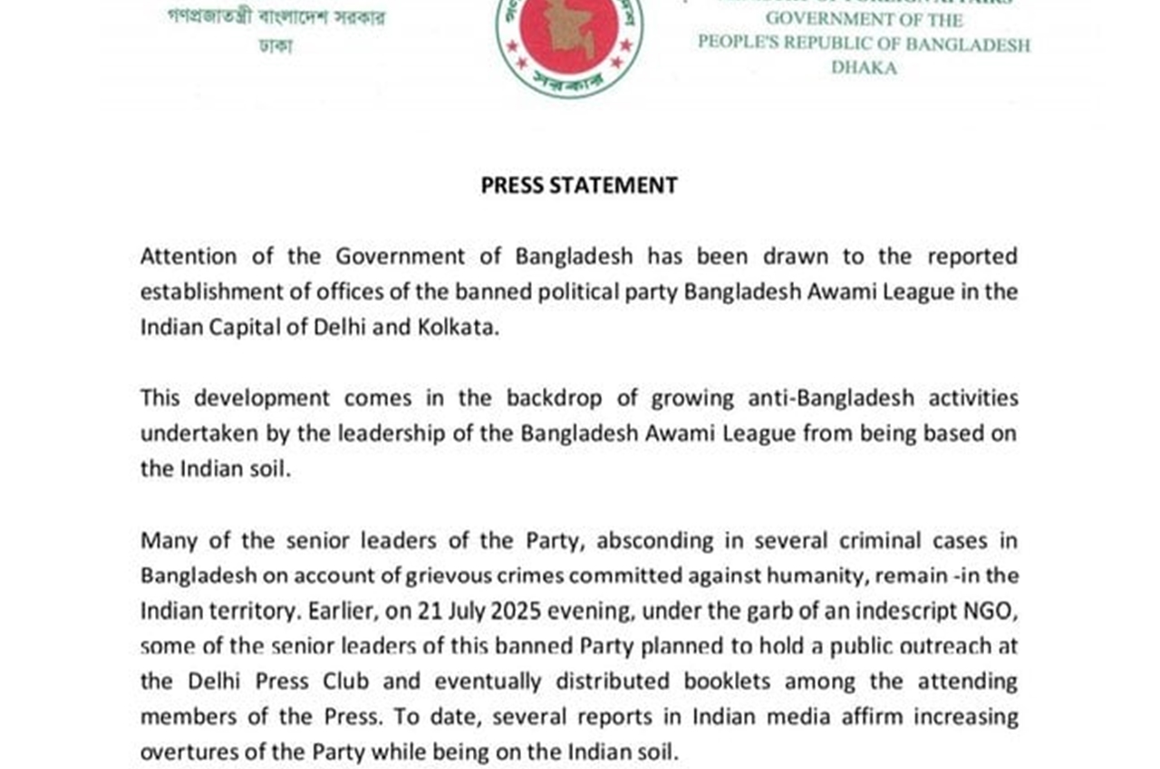 এর আগে বাংলাদেশের পররাষ্ট্র মন্ত্রণালয়ের বিবৃতিতে বলা হয়, দিল্লি ও কলকাতায় বাংলাদেশে কার্যক্রম নিষিদ্ধ থাকা রাজনৈতিক দল আওয়ামী লীগের অফিস স্থাপনের খবর বাংলাদেশ সরকারের দৃষ্টি আকর্ষণ করেছে। ভারতের মাটিতে আওয়ামী লীগের নেতৃত্ব কর্তৃক ক্রমবর্ধমান বাংলাদেশবিরোধী কার্যকলাপের অংশ হিসেবে এ ঘটনা ঘটেছে। মানবতাবিরোধী গুরুতর অপরাধের কারণে বাংলাদেশের বেশ কয়েকটি ফৌজদারি মামলায় পলাতক থাকা আওয়ামী লীগের অনেক সিনিয়র নেতা এখন ভারতীয় ভূখণ্ডে রয়েছেন।