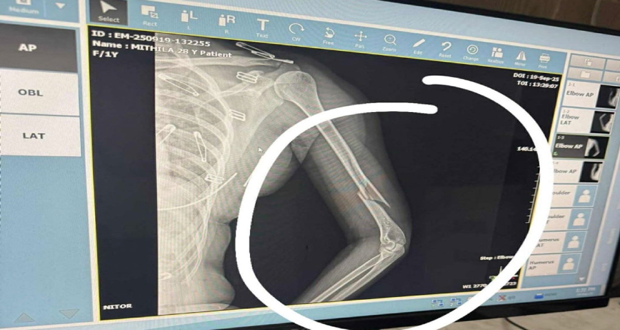 এক্সরে পরীক্ষায় দেখা গেছে, তার বাম হাতের কনুইয়ের ওপরের (বাহু) হাড় ভেঙে অনেকটা আলাদা হয়ে গেছে।