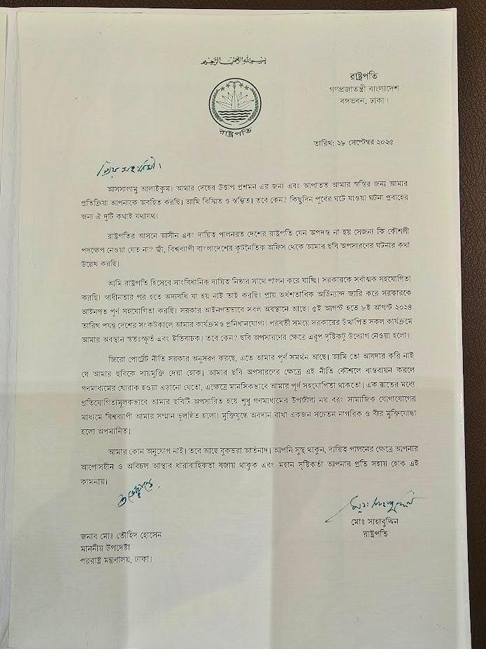 গত ২৮ সেপ্টেম্বর ২০২৫ রাষ্ট্রপতি ওই চিঠিতে স্বাক্ষর করেন। তবে পররাষ্ট্র উপদেষ্টা তৌহিদ হোসেন এখনও চিঠিটি পেয়েছেন কিনা সেটি নিশ্চিত করতে পারেননি সায়ের।
