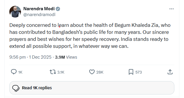 নিজের এক্সে এক পোস্টে মোদি লেখেন, ‘বেগম খালেদা জিয়ার স্বাস্থ্যের বিষয়ে জেনে গভীরভাবে উদ্বিগ্ন। বাংলাদেশের জনজীবনে বহু বছর ধরে তার গুরুত্বপূর্ণ অবদান রয়েছে। তার দ্রুত সুস্থতা কামনা করছি। ভারত সম্ভাব্য সব সহায়তা দিতে প্রস্তুত—যেভাবে পারি।’