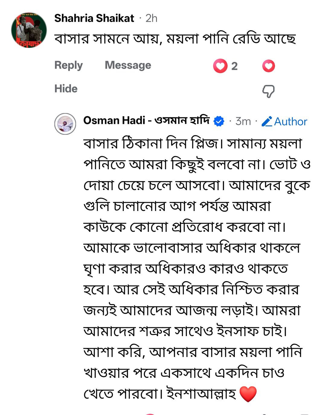 বাসার সামনে আয়, ময়লা পানি রেডি আছে- ওসমান হাদির নির্বাচনী প্রচারণার পোস্টে এমনই কমেন্টস লিখেছিলেন একজন ভোটার। তার জবাবে ঠিকানা জানতে চেয়ে হাদী বলেছেন, ‘আমাদের বুকে গুলি চালানোর পূর্ব পর্যন্ত আমরা কাউকে কোনো প্রতিরোধ করবো না। আমরা আমাদের শত্রুর সঙ্গেও ইনসাফ চাই। আশা করি আপনার ময়লা পানি খাওয়ার পর আমরা একসাথে একদিন চাও খেতে পারবো। ইনশাআল্লাহ।’চরম শত্রুর সঙ্গেও ইনসাফের বার্তা দেওয়া সেই ওসমান হাদীই এবার শিকার হলেন বে-ইনসাফের। শুক্রবার রাজধানীর বিজয়নগর এলাকায় জুমার নামাজের পর তাকে গুলি করে দুর্রৃত্তরা। গুরুতর অবস্থায় তিনি এখন চিকিৎসাধীন রয়েছেন ঢাকা মেডিকেল কলেজ হাসপাতালের সিসিইউতে। জানা গেছে, মোটরসাইকেল যোগে দুজন দুর্বৃত্ত তাকে লক্ষ্য করে গুলি চালিয়ে পালিয়ে যায়। এতে ওসমান হাদী মাথায় গুলিবিদ্ধ হন। এখনো তার মাথায় গুলি রয়েছে বলে জানিয়েছে চিকিৎসকরা।