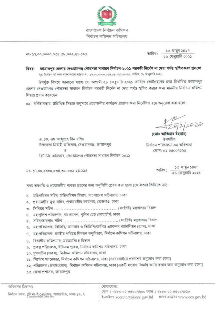 নির্বাচন কমিশন সূত্র জানায়, নির্বাচন ব্যবস্থাপনা-২ অধিশাখার উপসচিব মো. আতিয়ার রহমান স্বাক্ষরিত একটি প্রজ্ঞাপনে দেওয়ানগঞ্জ পৌরসভা সাধারণ নির্বাচন পরবর্তী নির্দেশ না দেওয়া পর্যন্ত স্থগিত করার জন্য নির্দেশনা দেওয়া হয়।